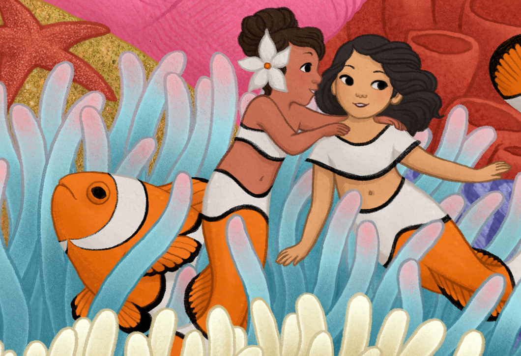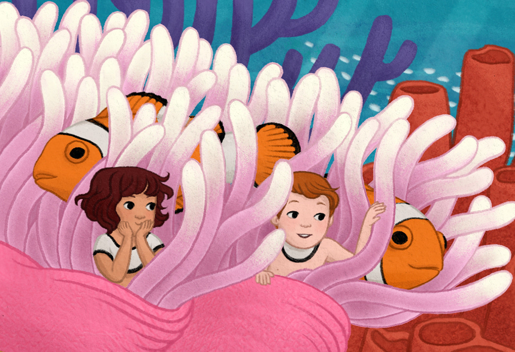 A little school of clownfish merchildren enjoy a beautiful day on the reef.