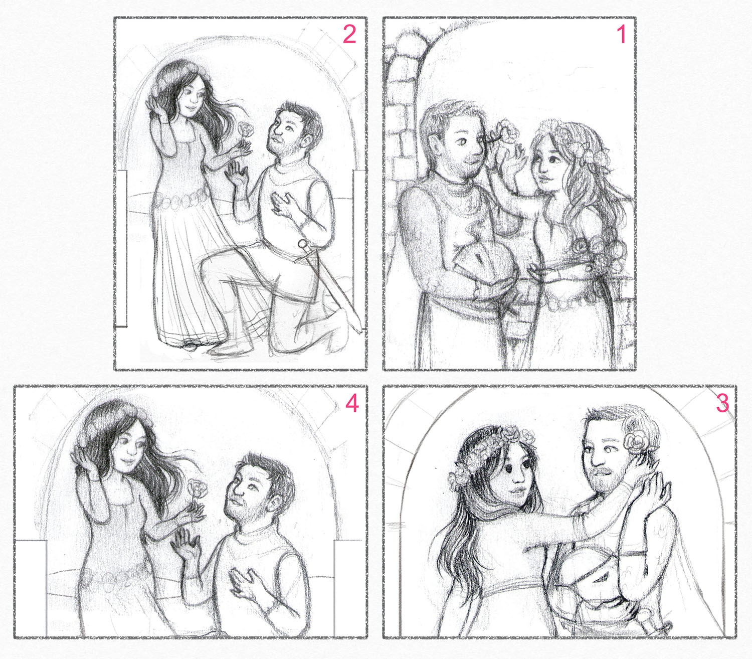 The lady bestows a favor upon her brave knight. A commissioned couple's portrait painting. 2015.